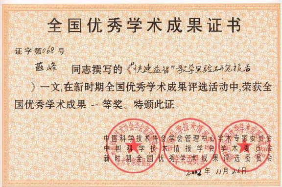 提高学生素质》、《开发人脑潜能、实施素质教育的美好图景——“快速益智”教学实验研究报告》、《大脑两半球与“快速益智”》等30多篇论文,获中国科协、教育部中央教科所《教育研究》、《人民教育》杂志社、国家教委素质教育理论与实践研究课题组、北京市教育学会、国际级学术研讨会等权威部门颁发的国家级和国际级优秀论文一、二、三等奖和优秀作品奖。(仅2000年——2002年间,就有27篇论文在国内外正规媒体公开发表,其中国际级4篇,国家级16篇,省级7篇;25篇论文荣获国际级优秀论文奖或国家级、省级优秀论文一、二、三等奖,其中国际级3篇,国家级19篇,省级3篇)。曾编写出《写作》、《逻辑》、《文选》等教材,主编、参编论著两种,撰写《快速益智》系列专著一部。他辅导的实验班学生在毕业前,有5人被吸收为国家级学术研究会会员,5人在全国大赛中获奖,50多名在《青年知识报》、《师范教育》等国家级和省、市级报刊上发表80多篇文章。他辅导江苏、河南、广西、吉林、内蒙古等10多个省的有关老师参加“快速益智”函授学习,他们自己获益后,带领子女学习,同样得益,进而薛峰指导他们在大、中、小学开展这项教学实验,一般1—2学期,乱差班即赶上或超过好班,师生撰写的实验研究论文等,或在国家级、省市级报刊上发表,或在全国有关大赛中获奖,或在国家级、国际级学术讨论会上宣读,快速提高了所在学校和自己的知名度,大大提升了自己的人生价值。他辅导全国各省市和海外一些国家的各界人士函授学习“快速益智”,都受到了增强全脑功能,激发人体潜能,益智培德,防治近视,美容疗疾,养生延寿,大幅度提高学习、工作成效等多方面的效果,使许多中、差生中考、高考金榜题名;使原来较好的变得更好,或在评优晋升中捷足先登,从此改变了一生命运,或考入重点大、中学校,或升学少交几千、几万元;有的参加函授学习,全家3口都得益,申请办班推广;有的学校校长函授受益后,为了办名校、出名师、育名生,决定全校开设“快速益智”课;有的高校党委书记学习后在大学生中积极推广,选班开设“快速益智”课,并亲自执教。特别是河南南阳油田教育处杨光歧处长带领有志于智力开发实验的同志一行七人赴江苏东台师范学校进行实地考察,深受启发和鼓舞,特邀这个学校“快速益智”创始人薛峰等三位老师去油田讲学,举办培训班,70名中小学教师通过刻苦学习,转变了观念,提高了认识,决心在教育实践中进行尝试。教育处研究决定在油田大力推广“快速益智”,命名为“中小学智力开发实验与研究”,并被中国石油教育学会正式批准立项,确定为“九五”教育科学研究规划课题。在杨光歧处长和智力开发教研员杨金娜等的组织和领导下,培训班学员积极推广应用“快速益智”,取得了大面积丰收。推广应用后的第一年高考,理工、文史、外语上线分数比历史最高水平上升33.7%,第二年又比前一年提高了44.7%。新华社等权威媒体记者赞誉为:创造性地推广应用