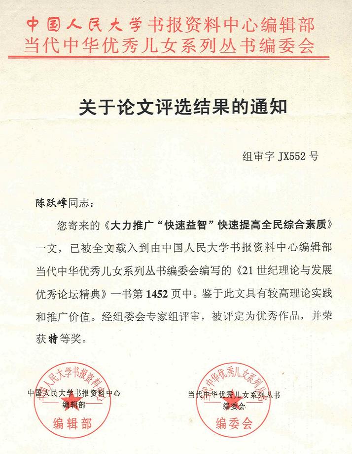 “快速益智”,是“用全脑教育试验带动课堂高效益”、“播种二十一世纪的希望”、“架设面向21世纪的成才立交桥”。他的个人业绩和代表论文被收入《世界名人录》、《世界优秀专家人才名典》、《托起太阳的人们》、《中国当代著作家大辞典》、《中国当代科技专家大典》等20多种典籍和中央电视台等权威部门摄制的《实用记忆在东师》、《陈跃峰主持“快速益智”教学实验10年成绩裴然》、《开发右脑初探》、《研创"快速益智"的人一陈跃峰》等专题电视片。