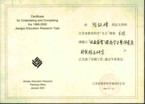 《“快速益智”提高学生整体素质的实验与研究》于1988年9月初率先在江苏省东台师范学校开题,很快取得“令人信服,令人惊叹,令人鼓舞”的成效,在国内外产生广泛影响。经过10多年的滚动实验研究,2001年,权威部门组织的专家鉴定组对这项科研课题(国家教育部重点科研项目"科学教育—开发儿童少年潜能研究"的子课题)进行了考察和科学测评,通过专家鉴定,并给予高度评价。