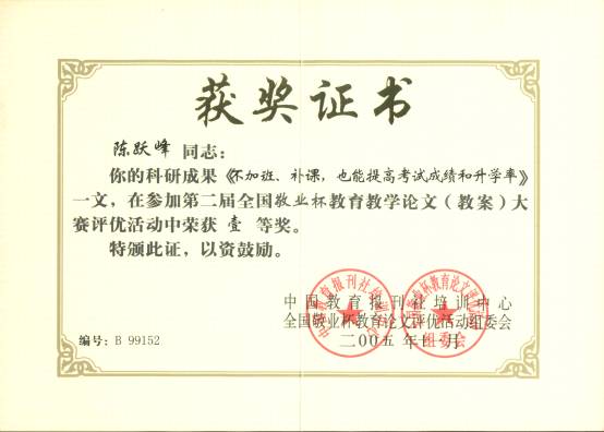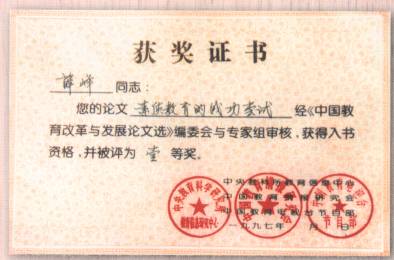 “97〞跨世纪教育论坛会议”由中央教育科学研究所、中国教育情报研究会、中国教育电视台等单位联合主办,薛峰的论文《素质教育的成功尝试》获一等奖。