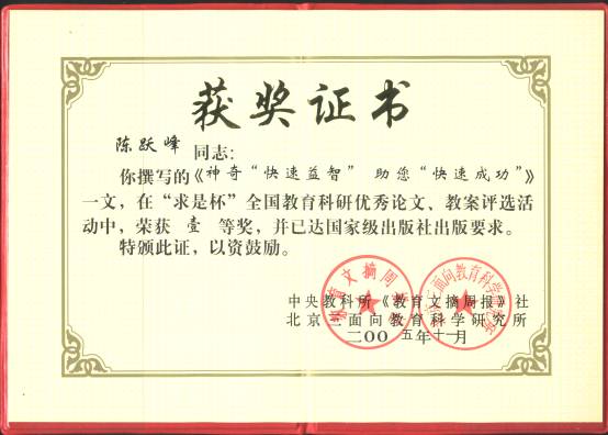 “快速益智”,是“用全脑教育试验带动课堂高效益”、“播种二十一世纪的希望”、“架设面向21世纪的成才立交桥”。他的个人业绩和代表论文被收入《世界名人录》、《世界优秀专家人才名典》、《托起太阳的人们》、《中国当代著作家大辞典》、《中国当代科技专家大典》等20多种典籍和中央电视台等权威部门摄制的《实用记忆在东师》、《陈跃峰主持“快速益智”教学实验10年成绩裴然》、《开发右脑初探》、《研创"快速益智"的人一陈跃峰》等专题电视片。