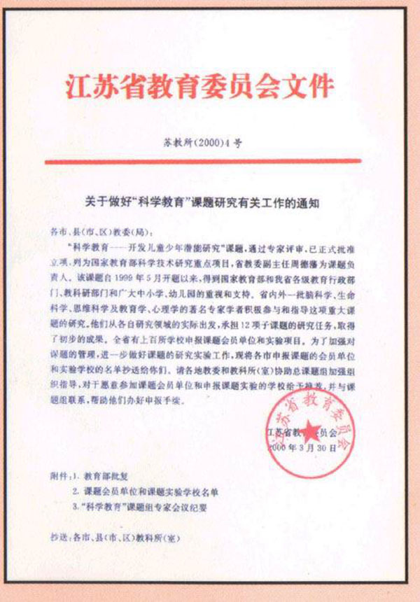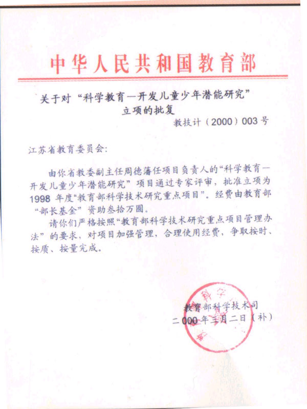"科学教育——开发儿童少年潜能研究"是国家教育部的重点研究课题。该课题根据李岚清副总理的指示精神提出,经教育部批准立项,由江苏省教委承担。教育部副部长韦钰亲任课题高级顾问。1999年5月24日教育部在南京大学正式宣布该课题开题.根据教育部领导的指示精神,课题研究实行脑科学与教育学结合,理论与实践结合,省内与省外结合,国内与国外结合,实验周期为十年。图为韦钰副部长在"科学教育"开题报告会上。