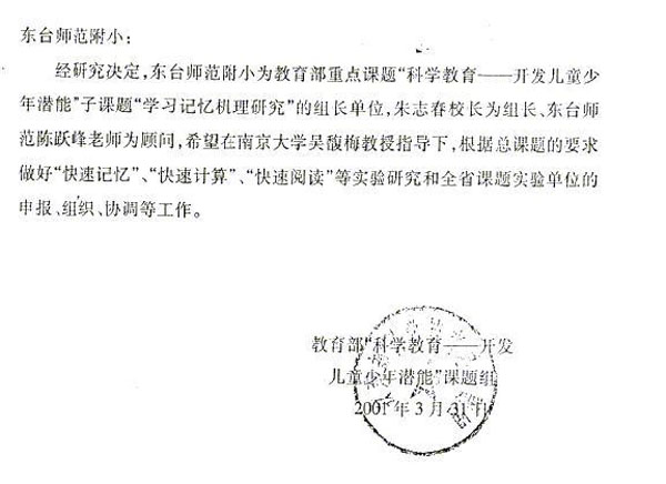 "快速益智"(“学习记忆研究”课题研分为综合和单项等多种。单项如"快速益智"与语文教学、"快速益智"与作文教学、"快速盗智"与阅读教学、"快速益智"与英语教学、"快速益智"与作文教学、"快速益智"与识字教学、"快速益智"与数学教学、"华智操"与体育教学、"华智操"与心理素质"、“高效阅读”提高语文教学质量的实验研究、“高效记忆”提高……这些课题都是"快速益智"的子课题,涉及的范围小,相对而言,操作比较简单,更容易达到预期效果。有的子课题还可以再分为若干更小的课题进行实验研究。实验周期可以是6年、5年、4年、3年,也可以是2年、1年。各人可根据自已和所在单位的实际情况确定选用哪类课题。可先填写《国家教育部"科学教育_____