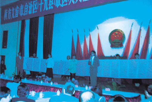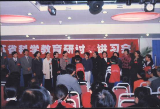 在教育部的关心、支持下,江苏省教委(教育部)召开了以开发脑潜能、激发创造力为主题的“科学教育研讨、讲习会”,国家教育部副部长韦钰、科技司司长黄黔、基础教育司副司长朱幕菊等7位司局长出席了会议,“快速益智”向大会作了汇报,获得一致好评。图为东台师范“快速益智”班学生表演速记15位代表的姓名相貌,观众看后惊叹不已。