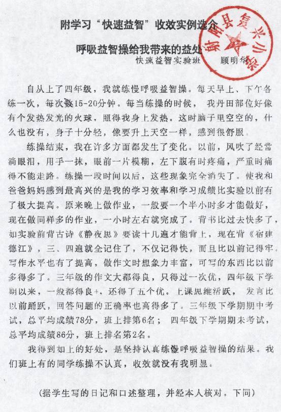 下面是认真学习“快速益智”的学生收效实例选介(资料来源:根据学生本人写的日记和口述整理,并经本人和学校领导核实签字盖章打印稿)