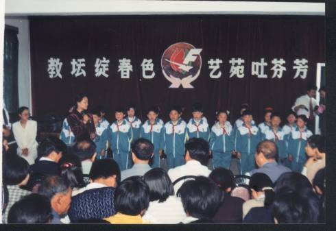 江苏省东台师范第一、二、三、四轮薛峰快速益智实验班学生丁晓梅、冯永枚、林晓霞等毕业后分配在东师附小任教。在校长朱志春等领导的大力支持下,她们积极推广应用薛峰快速益智,取得显著成效。图为她们带领该校实验班的小朋友成功地表演速记由观众当场出示的20种小物品。出席东台市教学改革和科研成果展示会的有关领导和老师观看后交口赞扬小学生“过目不忘”的本领。